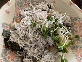 ご飯の上に、海苔、ごま、カイワレも乗せて・・・
