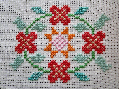 勝利の赤い色でお花をステッチ。