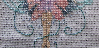 手持ちの刺しゅう糸、ビーズ、ラメ糸で作成。