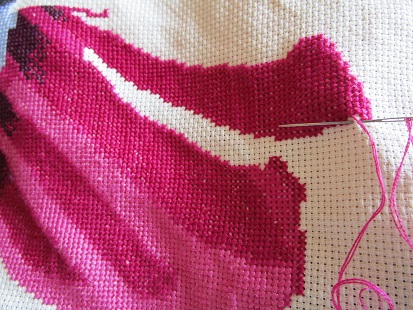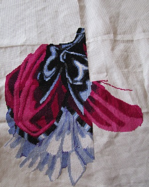 コタツに座椅子、ステッチの材料をテーブルに置いて・・・