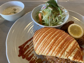 オムライス、カキフライ、サラダ、スープですね。